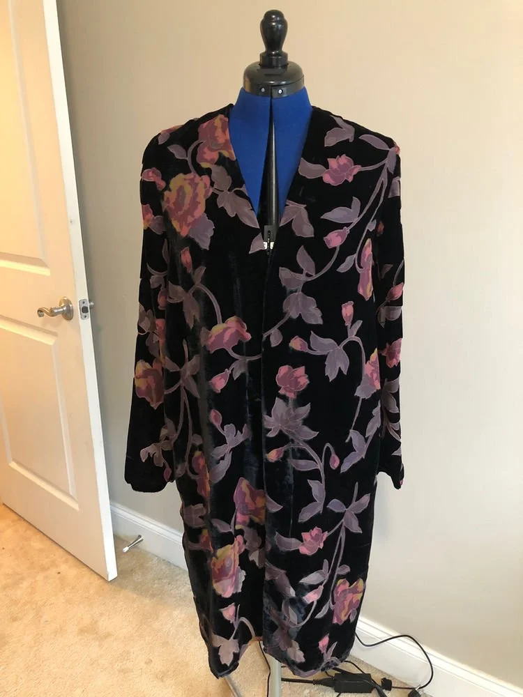 First, this project and post was initially born out of inspiration from a sew-Sister Erica Bunker - check her out at www.ericabunker.com. Last fall she posted a tutorial on making a kimono and sewing with velvet. I thought her kimono made with this burnout fabric was beautiful and months later I'm in Joann's and saw the same fabric Erica used for her kimono. I had to have it! The velvet didn't disappoint - it can be difficult to work with, it's messy from cutting and it dances under the needle and on top of the feed dogs. Velvet is not like I describe denim or a nice dress crepe - it does NOT do what you tell it to do. Velvet will do it's own thing and you must have patience and a forgiving project: like my duster coat from Simplicity 8059. It didnt disappoint either. Enjoy!