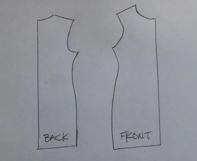 Begin with a basic dress front and back pattern pieces. OR, draft a dress from pattern pieces #1 and #3 from Butterick Pattern 6490 View D