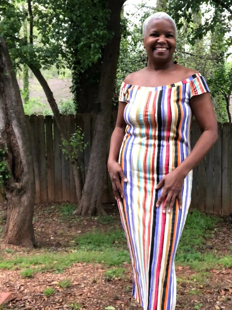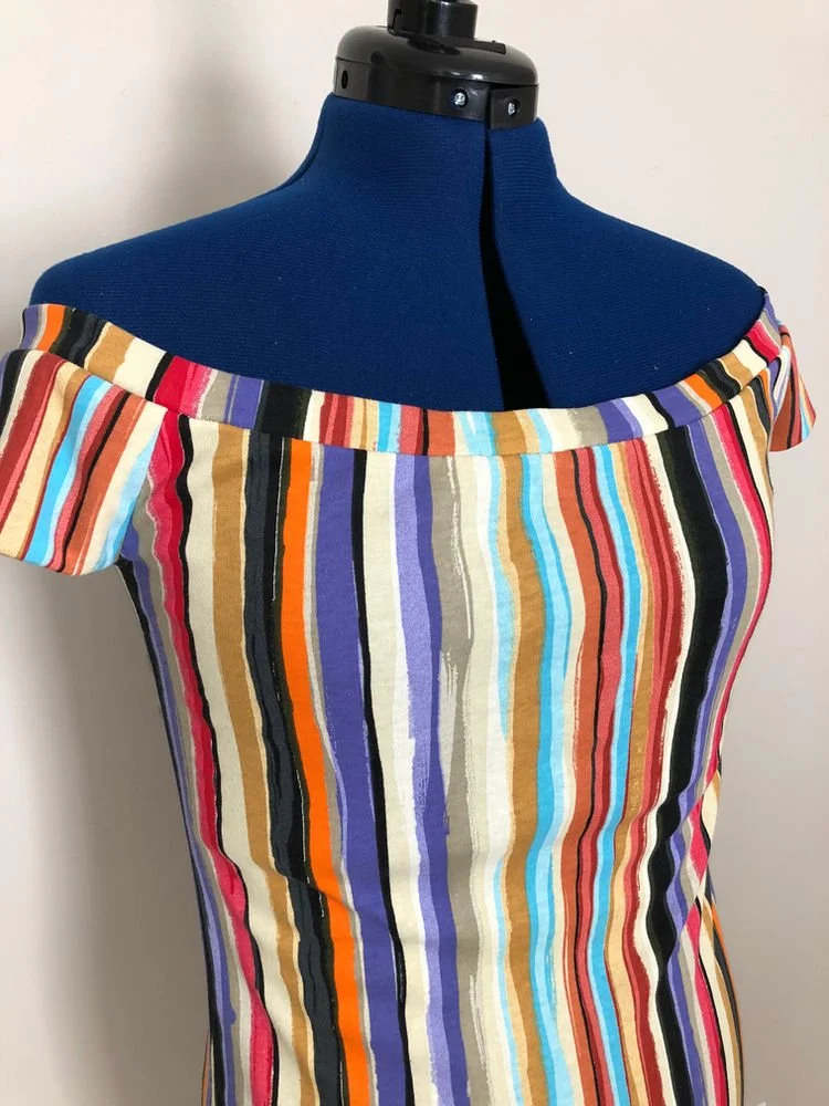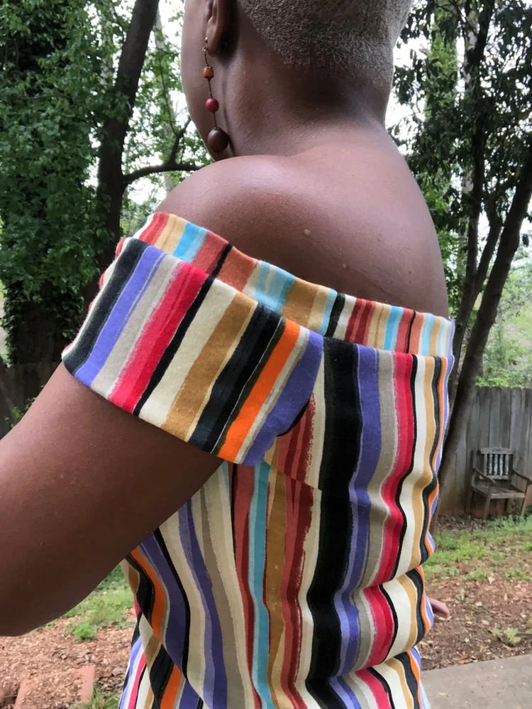 Standing outside really shows the colors, I will probably live in this dress on the weekends. Love how it turned out. I tried to test my pattern matching skill on the neck band, but heres another sewing tip - the pattern of a stretched neck band cannot match the base design. Maybe if the design included using elastic instead of the fabric stretch, maybe. I wanted this dress (and others) to have a natural neckband that self-stretches rather than elastic.