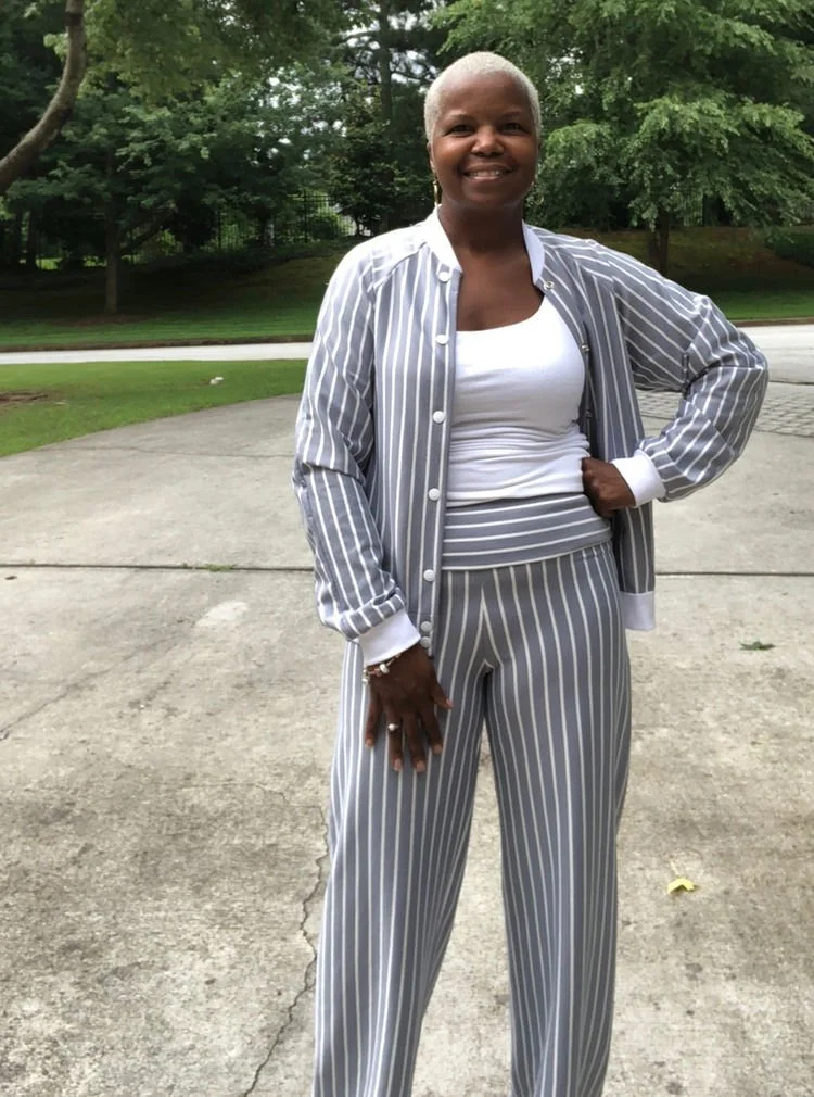 The pants are perfect, a great pattern from Simplicity D0961 with an extremely comfortable waistband. Great fit and the pant legs are just wide enough to be elegantly casual for heels or flats. Matching the stripes was easy and the I will be making these again. The jacket behaved generally well except when I wanted to use a sport zipper - NOT! I put in the zipper 3 times, the last time by hand and the fabric curled and stretched and I was done. I then decided to use snaps and had to order white ones from Amazon...two days later I could finish my jacket. Using the snaps takes practice and muscle, especially if your knit fabric is folded as seen at the bottom flaps of the jacket. And the snaps packet only comes with 7 snaps so if it's your first using these snaps (Dritz brand), buy some to play with and get good at applying them.