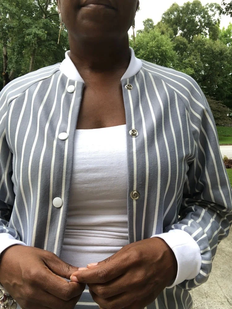 Recently I was in Fine Fabrics (Atlanta) and found a row of stripes in knit fabrics and thought about a small capsule. What a fun idea and this was the first concept, a bomber jacket and pants to go with it! The fabric is knit and typical of some fabrics in warehouse stores, if you're not careful you will purchase your stripes or other pattern against the fabric grain. This fabric was just that example, so my garments are made opposite the grain with the exception of the pants waist-band. Who knew how it would turn out, but surprisingly the pieces constructed great and both are very comfortable. I didn't line the jacket because I wanted a light weight summer jacket to wear. I'm thinking about doing a sew-a-long for an unlined bomber jacket, very easy.