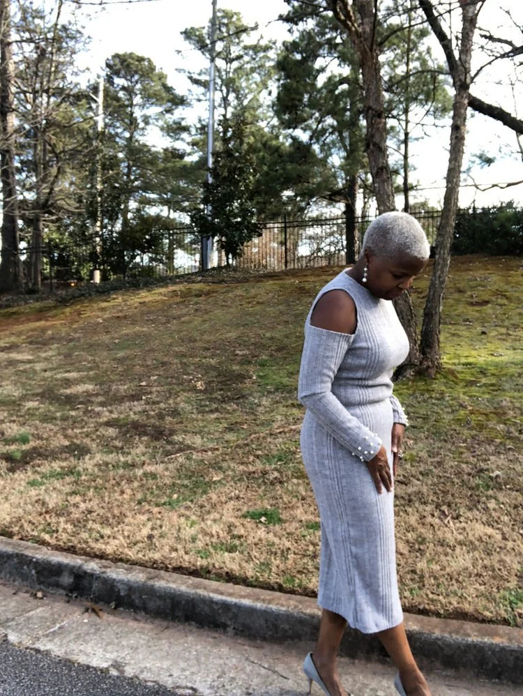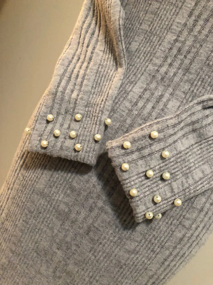 One of my favorite dress projects is when I take a great top pattern – knit or shirt style – and make it a dress. This one is a perfect for work, Saturday night or Sunday, McCall’s 7621 View B. I took a very short dress and lengthened it. Back in December I was in Joann’s where I rarely see a great apparel fabric. I don’t shop at Joann’s for apparel fabric so when I saw this cozy sweater knit I had to grab it. New Year’s Eve evening I made this dress and two t-shirts. The dress sat for a month because it looked kinda plain, so I hand-beaded pearls to the sleeves, giving it that touch that I love: an unexpected surprise on a dress.
